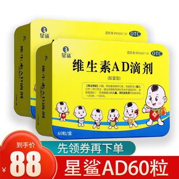 160.0元抢购星鲨 维生素d3滴剂 胶囊型维生素d滴剂维生素d婴儿童促进钙吸收预防佝偻病非悦尔星沙 AD滴剂60粒*2盒