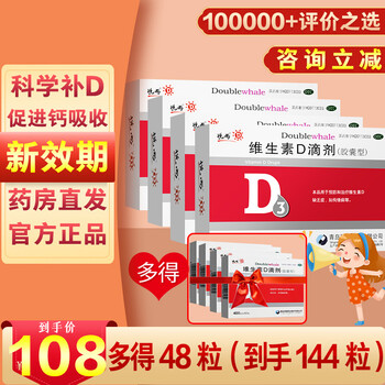 与《双鲸悦而 维生素D3滴剂胶囊型婴幼儿童补充VD维D3悦耳 4盒24粒+4盒12粒【共144粒】》同类商品的售价: