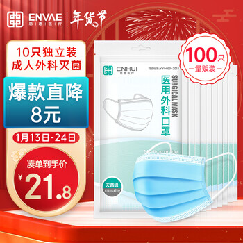 抢购恩惠医疗100只(每10只独立包装/袋*10)成人医用外科虎年口罩保暖男女防细菌防粉尘防沙尘暴10只/袋*10