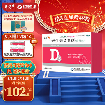 78.4元抢购双鲸 悦而 维生素D滴剂每粒含维生素D3 400单位*5*12粒/板/盒 预防维生素D缺乏 预防佝偻病